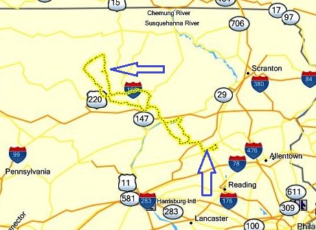 Our Pennsylvania warm-up ride. The lower arrow indicates Doug’s home in Port Carbon, and the upper arrow, Kevin’s cabin up in the mountains of central Pennsylvania.
