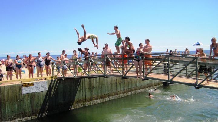 Bridge jumpers at Basin Head. It looked like fun. Once in the water, the river washes you out to sea, onto a shallow sand bank, where you can then clamber back onto the shire and take another turn at jumping off the bridge…