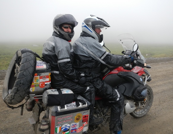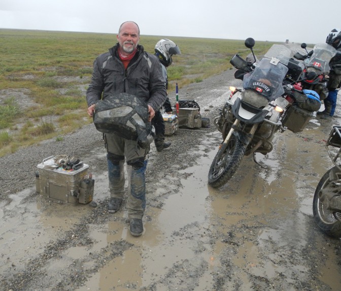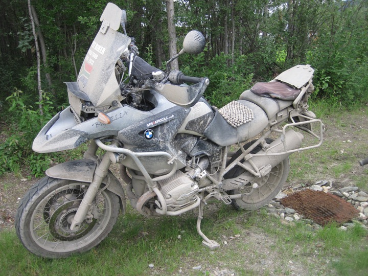 on the wrong side of the road somewhere in S, America and “missed your pannier by inches”. You are obviously an excellent rider to accomplish what you have but Ice Road Truckers is filmed on the Dalton for a reason, its a dangerous road with lots of drama and that’s with vehicles with dozens of wheels, you only have 2. In addition a GS is plain useless in slippery conditions, I disagree that the training that tells you when you hit loose stuff is to stand on the pegs, lean forward and power your way through. At a weekend training session a few k’s from your home with no luggage, fine, but hundreds of K’s from nowhere with a serious load? I think you just proved my point. You probably know that GS stands for “G’n Sand”. Anyway, best wishes for a speedy recovery.