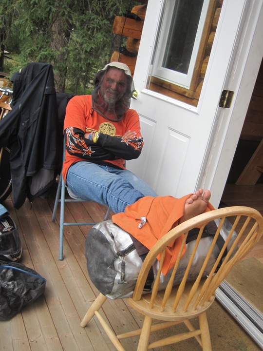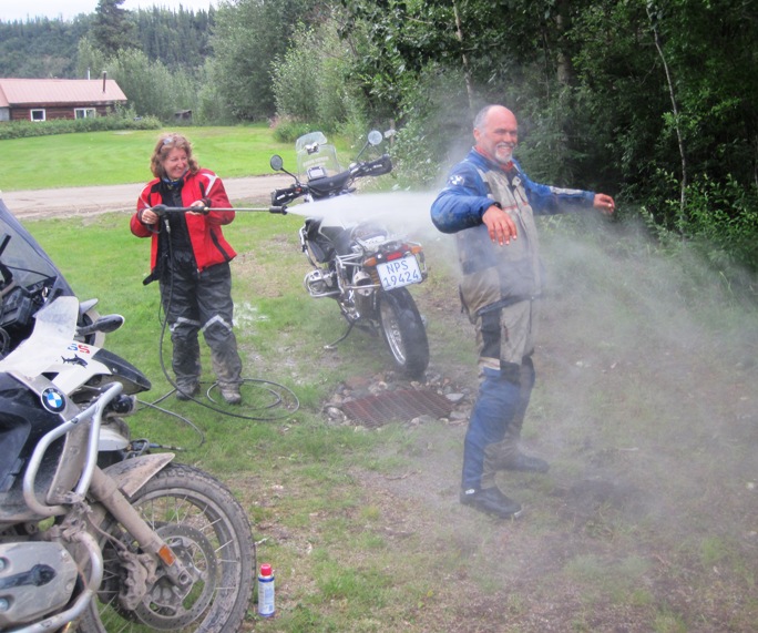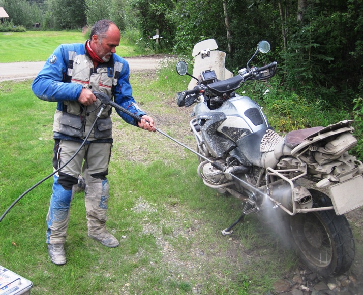 We washed our bikes and all our gear, before Trevor rode the Big Fella to the front of the cabin… Even he was surprised at how tall it sat with all the luggage off it… I could see by the look in his eyes that he wondered how the heck I managed to ride a bike that was set up to stand so high off the ground…!!