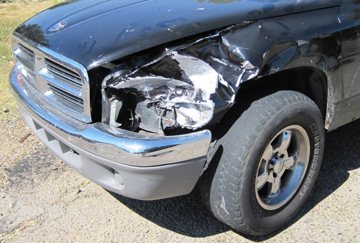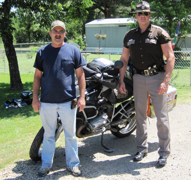 The first officer offered to load my damaged pannier onto his pick-up and drive it to the spot where I had parked the Big Fella. (“Too darn far to carry it all by hand…” I think he mumbled.) The state trooper set about gathering our insurance details; giving the driver, Terrance King, a ticket for negligent driving, after accepting his statement that he was at fault; and then sat in his car to type all the info into his computer.
