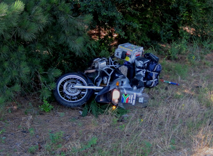 My left pannier had been ripped off the bike and it’s contents strewn across the road… The fuel bottle will no longer serve any purpose apart from reminding me that I now can only carry 6 litres of extra fuel !!