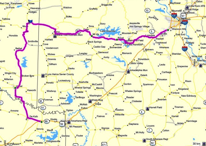 I had arranged to spend the evening of the 30th of June with Doug’s parents in Arkansas, which was a shortish ride of only 450 km away from the Tex Inn in New Boston. The Oklahoma state line was an hours ride to the northwest, and from there I had chosen to ride parallel to the Arkansas border to a point due west of Little Rock and then head east on the final stint.