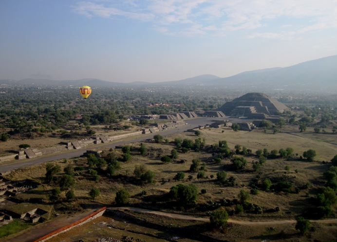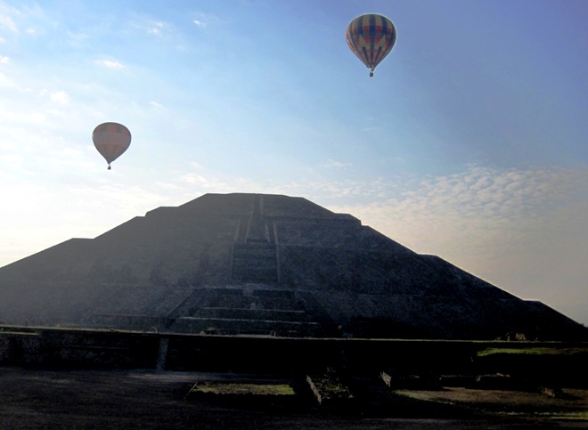 Early morning balloon flights are a popular way to view Teotihuacan... While I stood recovering from my climb, I watched three colourful balloons drift over the ruins...