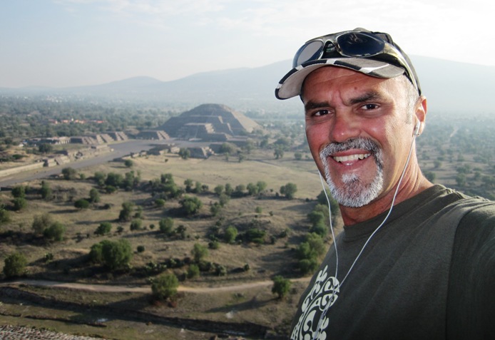 Atop the Pyramid of the Sun at Teotihuacan, with the Pyramid of the Moon in the background, a long walk away...!!