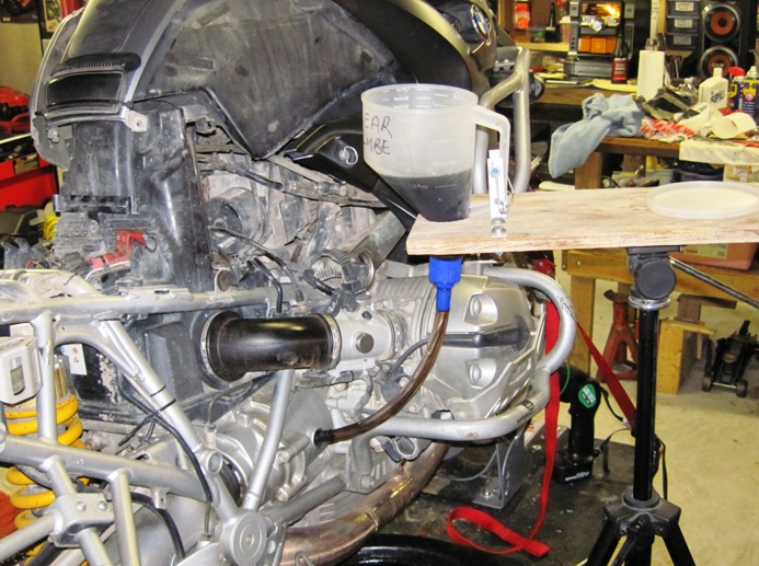 Doug’s gearbox filling invention consists of a camera tripod and large jug… (Theresa, if you’re wondering where your tripod got to, look downstairs…)