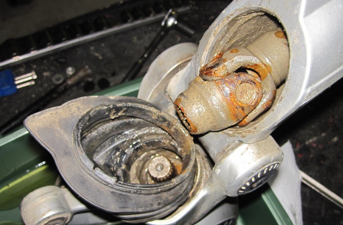 Seawater had clearly been making mischief inside the housing… The universal joint was covered in flash rust. We tried turning the hub and found that it was as stiff as a board…