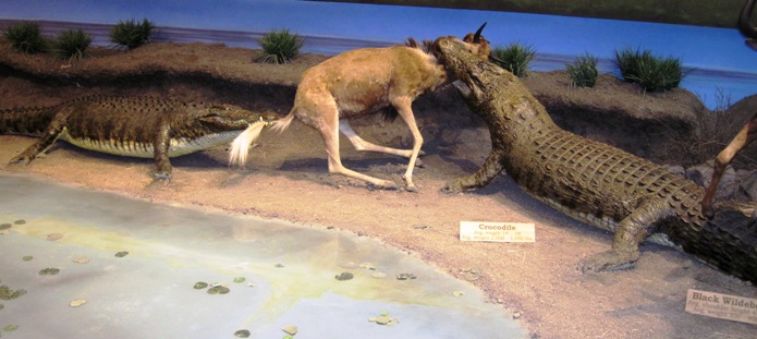 But on the other end, a young wildebeest was being tag-teamed by a pair of crocodiles… I had never seen an animal caught by the tail before and figured that the person who had built the display had used a little “poetic licence”…