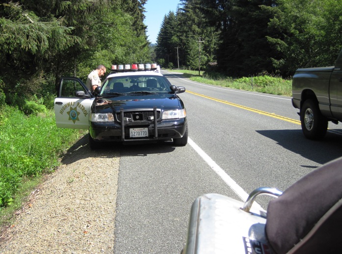 A mile down the road I thought I heard a sound that I had not heard on “18 ‘Till I Die” yet… It sounded very much like a siren…!! I happened to glance in my mirror and kissing my exhaust pipe was a big “black & white”…!!
