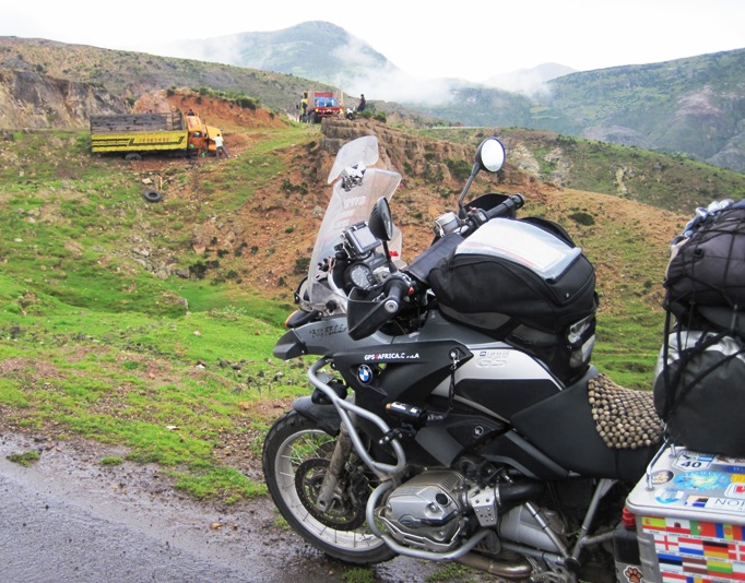 I stopped on a steep hillside to watch a gang of guys, trying to pull a truck up a slope… Using a much larger tractor-trailer, they managed to extricate the stricken vehicles, but not without much cursing and arm-waving…!!