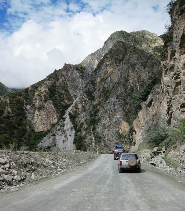The road then dipped down to a narrow valley, running between some impressive mountains… Parts of the road had either been torn up to be re-surfaced, or had been damaged by the recent rains…