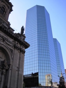 The ultra modern headquarters of a local bank, stand next to the Metropolitan Cathedral, which dates back to 1551...