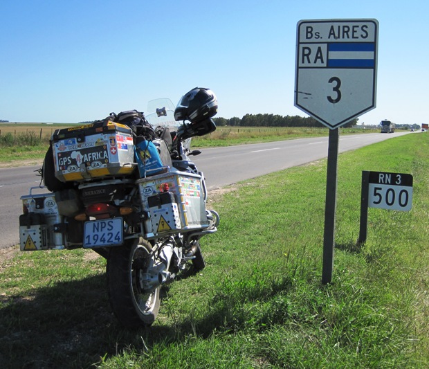 Two hours out of Bahia Blanco, I stopped at the sign that showed there was just 500 km to go to complete Ruta 3...