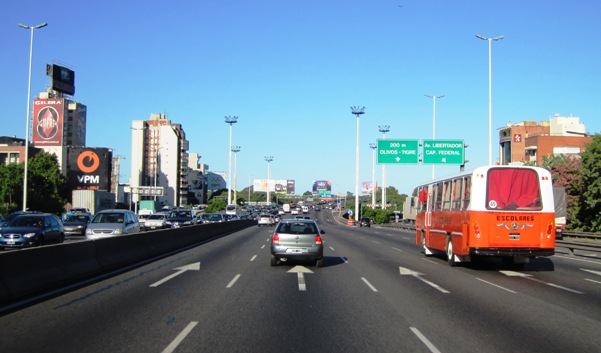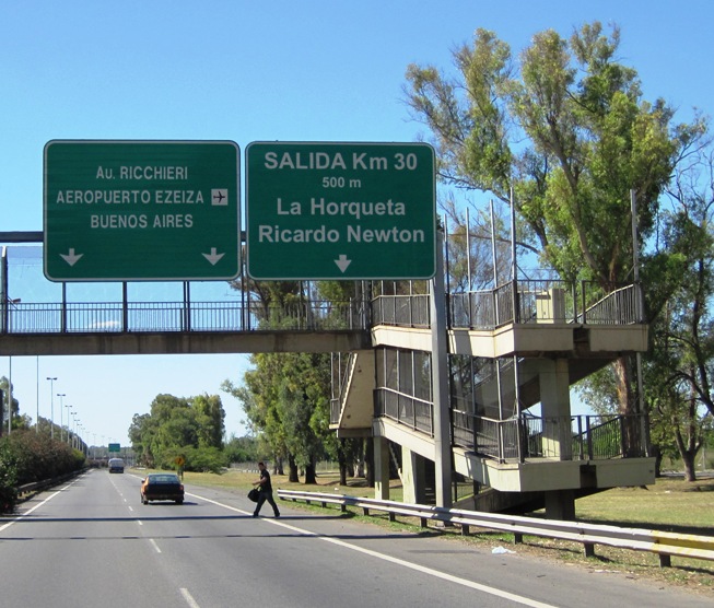 Our ride nearly came to an unscheduled halt, when I almost hit a lunatic pedestrian on the highway leading into the city…!! I was taking a photo of the first sign that showed I was entering Buenos Aires (see below) when the lazy idiot in the photo began crossing over the busy highway instead of using the pedestrian bridge right above him…