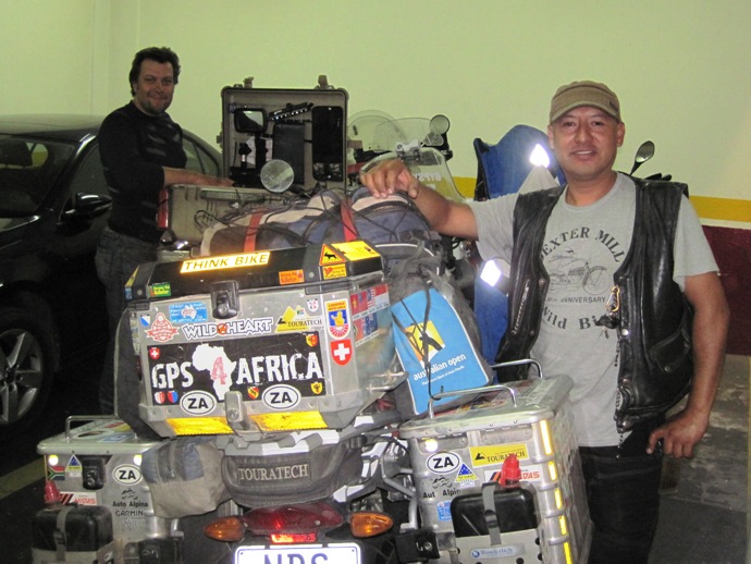 While he held a torch for me, I quickly removed the BMW shock, which he very kindly offered to deliver to Dakar Motors for me, and then lugged the gear that could not be locked onto the bike, up to his apartment where it would be safely stowed until my return…