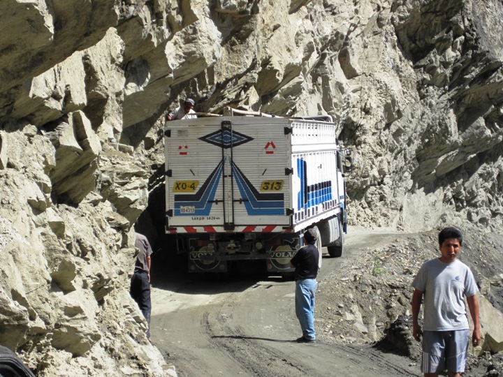 Standing up on the pegs to see as much of the track I was inching along, I came around a wide bend, and then saw that the road ahead was blocked by a parked truck… When I got closer, I saw that the truck was not so much “parked” , but wedged under an overhang…!!