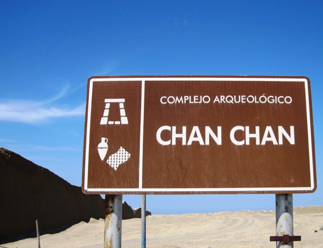 Chan Chan lies on the coastal desert plain, between the main road to Trujillo, and the Pacific Ocean… A well maintained dirt road leads 2 km off the main road, and at one point runs alonside a massive mud brick built wall that once formed the boundary of the city…