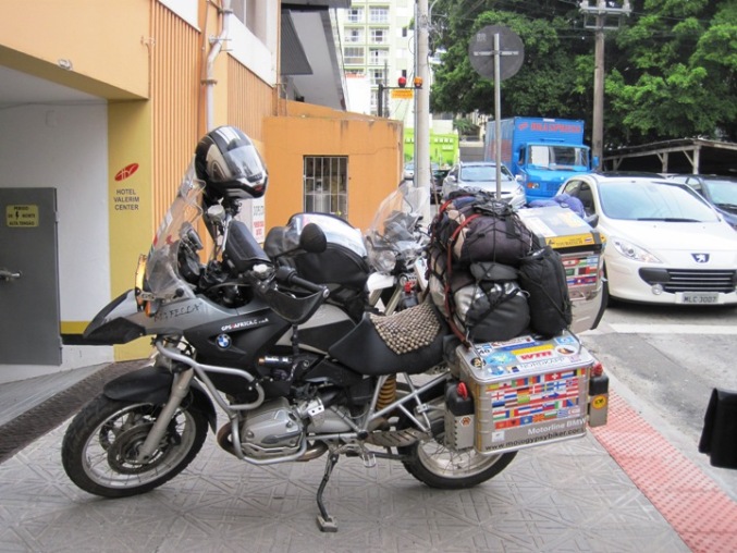 The Big Fella wait patiently on the sidewalk outside our hotel in Florianopolis, while Roger goes in to see about a room...!!