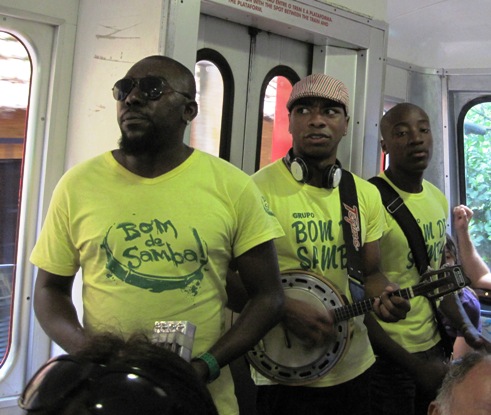 There are a few stations on the way up, and at one of them, a quartet of musicians hopped aboard, and began playing Samba tunes on the instruments they carried…