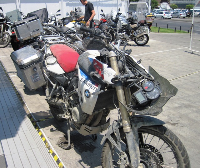 While we waited for the invoice to be printed, we saw a sad looking F800GS standing forlornly in the parking area… It’s front end was badly smashed, it’s consol hanging on by the wiring only… Every panel was cracked and the right hand pannier hung at a strange angle…