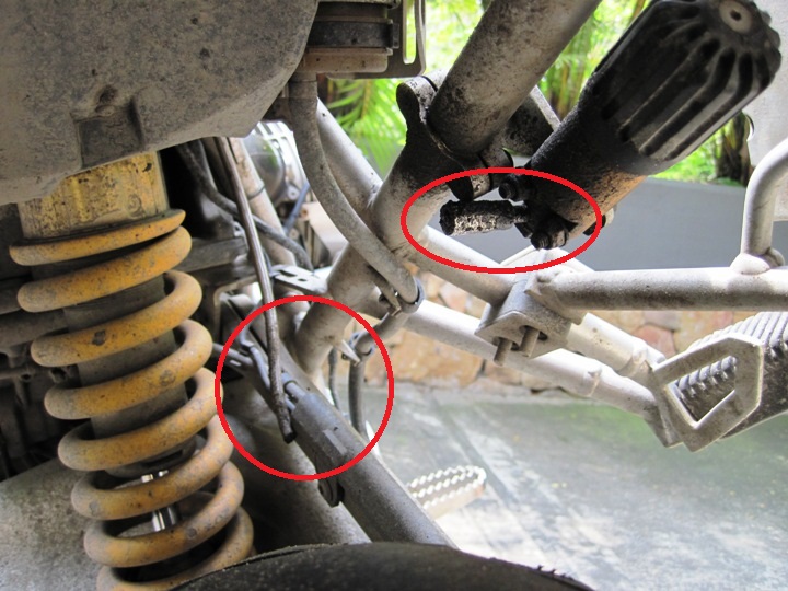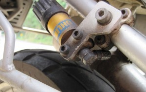 The hose connecting the oil reservoir to the pre-load adjustment had broken off at some point, and had perhaps been dripping oil onto the tyre, which, as you can imagine, made cornering on a twisting mountain road, a little tricky…!!
