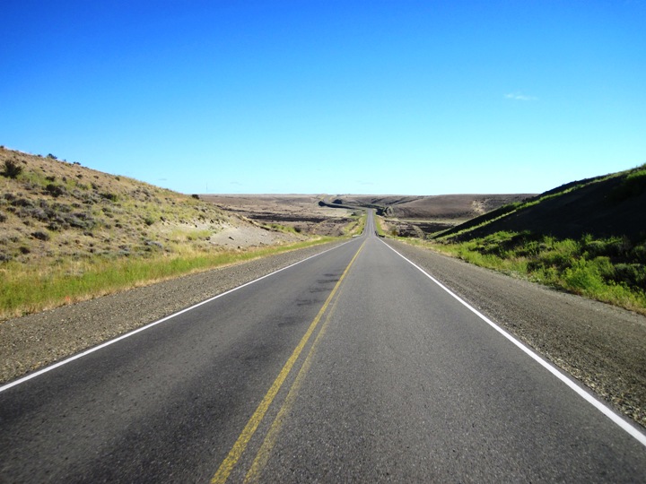 The scenery changed a little after that… A series of low hills forced the highway to dip and turn, following the lower slopes and ducking through a long series of valleys… Flocks of wind-blown sheep stood grazing resignedly, pondering the lean pickings of the dry plains around them…