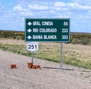 After refueling, I checked times and distances to Bahia Bianco… We could save about 50 km by avoiding the windier coastal road that went east to Viedma and then north to Bahia Blanco, by going directly north from San Antonio to Rio Colorado, then heading east again towards the coast and our final destination…