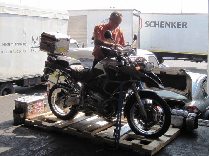 Although the air-cargo warehouse of Africa Freight Services is open for collections 24 hours a day, the South African Revenue Services are not as industrious !! I decided to tackle the delicate task of getting my bike released first thing on Saturday morning. Craig, my sister’s partner, and I duly arrived at the airport at 8.00 am and began proceedings…
