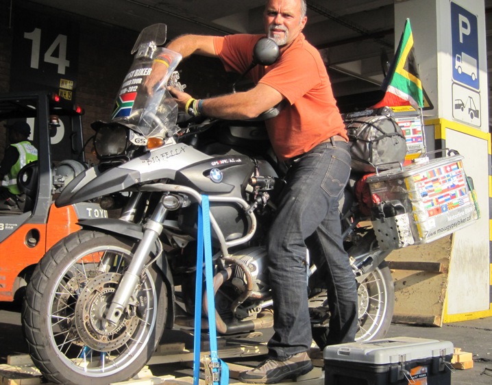 Then the process of using ten large cable ties to hold the panniers in place began. I noticed that my “good” pannier, the one that had never been damaged in any of the accidents I had experienced, was now bent out of shape… Both of the spare fuel canister holders had been broken off their bolts and were hanging loosely. This had happened somewhere en-route, and I debated whether or not to take it up with the shipping line…I decided that I would have a hard time convincing them of the seriousness of my claim, considering what the other buckled pannier looked like !! Besides, the photos I had taken of the bike being loaded in the USA were on my laptop back at Charmaine’s house… I was not prepared to leave the bike there a second longer than was necessary, so had to be content with dark mutterings about customs agents and forklift drivers…