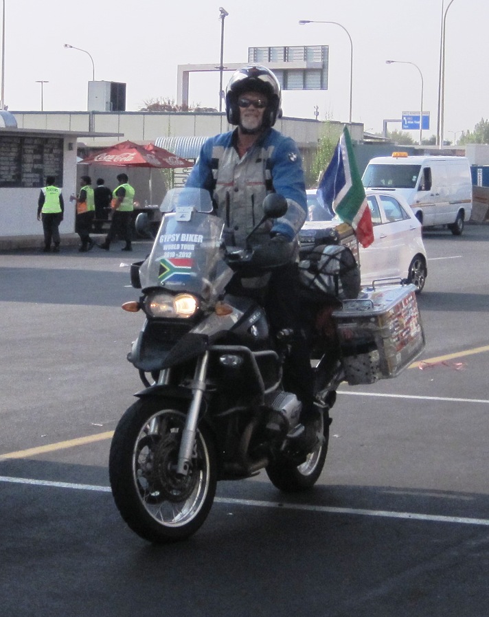 I put my jacket on, un-raveled the SA/USA flag, and attached the aluminum rod to it’s position on my top-box… A cheer went up from the crowd when they saw the flags and a number of bystanders wanted their photo taken with me…