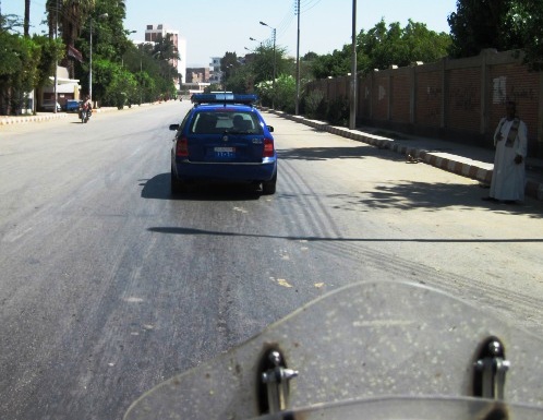 The road widened just before Asyut, and then cut across the southern part of it before entering into the heart of this large town… Traffic was at a standstill in places, and I got bogged down in the middle of it… While I was sitting at a crowded intersection, I felt a tap on my shoulder, and nearly fell off the bike with fright…!! It was a traffic cop, and he pointed in the direction of a patrol car, spoke briefly into his walkie-talkie, and then shouted,