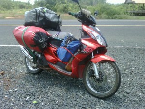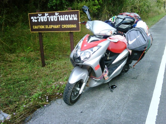 The "lightly loaded" scooter Willi is punishing through South East Asia... I think the elephants had better be the ones to keep a look out...!!