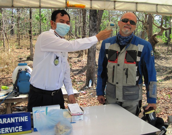 At the makeshift Quarantine Service gazebo, GB gets his temperature checked... If your temperature is above 38 degrees, you are not allowed into Cambodia...!!