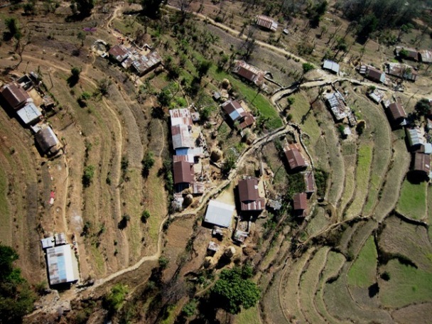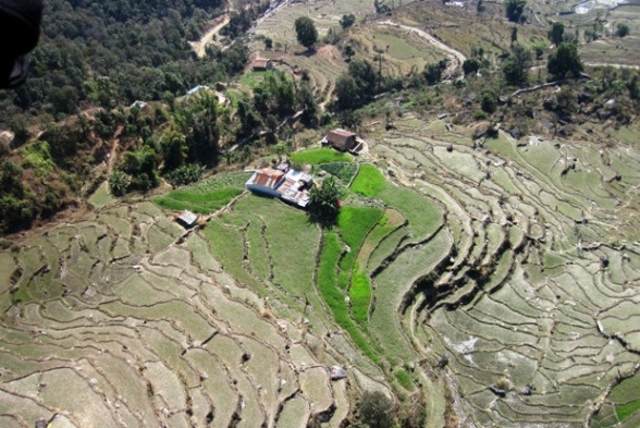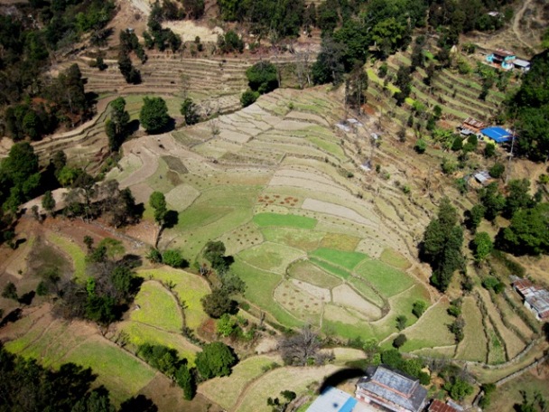 Dry plots waiting for the rains, surround other greener plots planted with the current crop of vegetables...