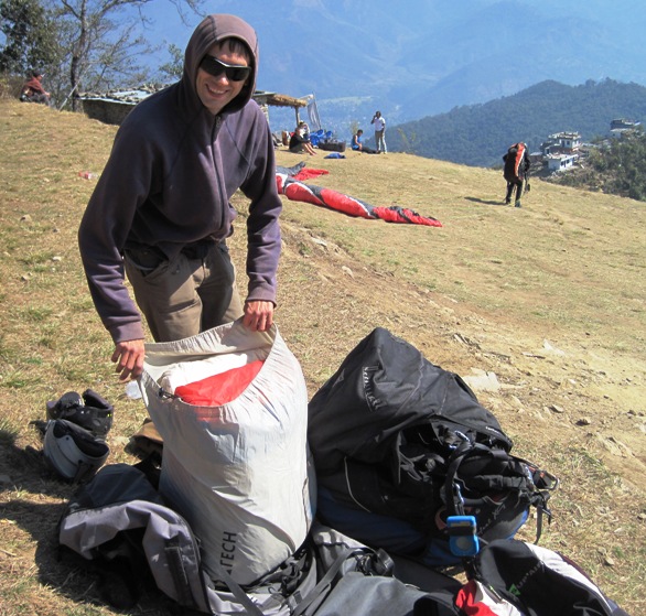 After waiting for the right conditions, Anton motioned me over to where he was already hooked up, clipped my harnesses into his, (I kept a VERY beady eye on this process…!!) then together we took a few steps forward to get the sail into the air and with a shout of “RUN…!!” we galloped down the steep slope and in seconds we were airborne…!!