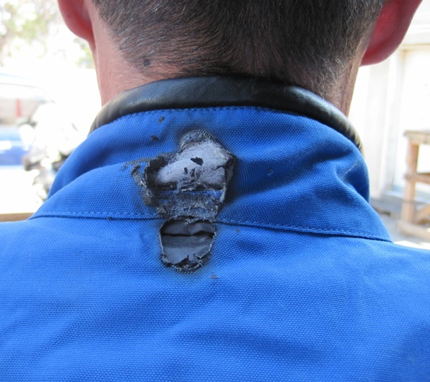 A large hole was burnt through the duffel bag, and from there, through the collar of my Rally-Pro jacket…!!
