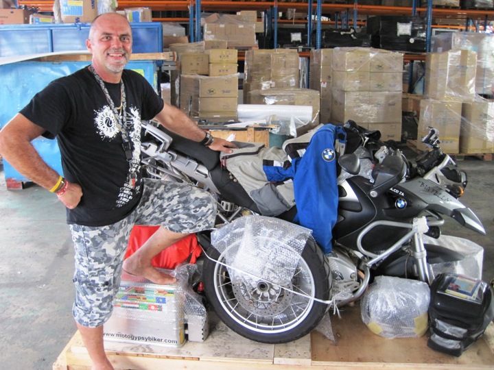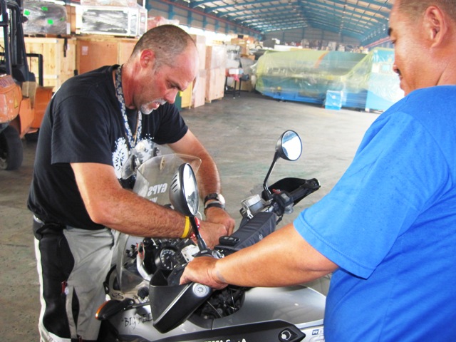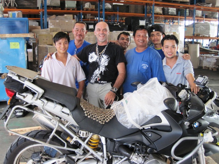 I had handed my camera to Ivor and asked him to snap away while we worked, and once the bike was firmly tied to the pallet, the guys wanted me to pose with it… They whipped out their cell phones and their manager even came out with an old SLR camera to take a few shots…