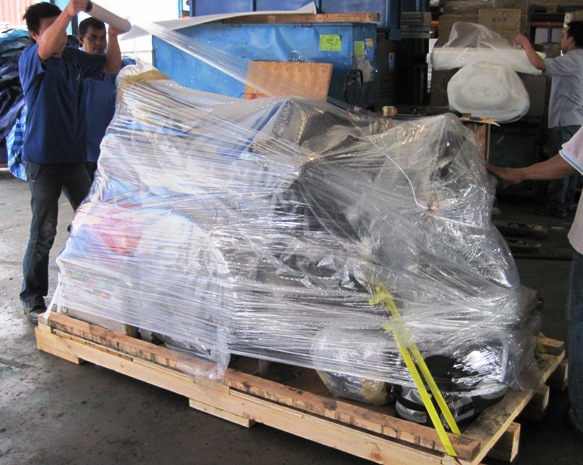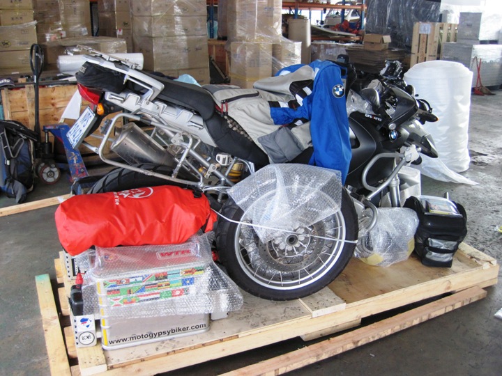 With all my gear packed tightly around the bike, the guys then proceeded to strap everything down, securing the entire ensemble to the pallet it stood on…