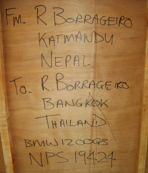 I made my way to Kathmandu’s cargo terminal by following the guys who had made the crate for the Big Fella… Until then, Jeewan Dhakal had made all the arrangements with the minimum of fuss, and it was a pleasure dealing with him… He and his company, “Eagle Eye Exports” (email: eagleeyes61@hotmail.com) have shipped hundreds of bikes out of Nepal since 1999, and are well known for their efficient and friendly service…