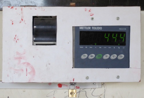 It weighed in at a eye-popping 444 kgs…!! Then the crate was manhandled off the scale and pushed about thirty metres away, lifted again and placed on the roller conveyor going into the x-ray scanner…
