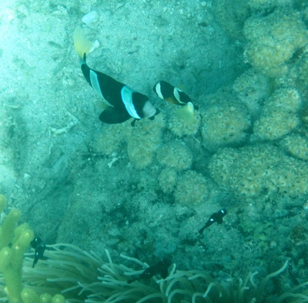 A large blue starfish, making its painstakingly slow way across an open patch of sugar white sand; a massive anemone, inhabited by half a dozen Domino Clownfish, all happily sharing their beautiful host; a big Rock Lobster, tucked into a crevice; and more beautiful reef fish than you could shake a stick at… (If snorkeling with a stick is your thing…!!)