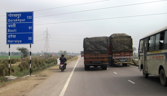 Dueling with trucks and buses on the way to Gorakhpur... And the biker on the left is about to run out of road...!!