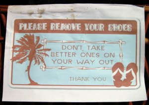 Sign at the Mekong Sunrise Hotel... I was bitterly disappointed, as my Flip-Flops were looking a bit ropey, and I had my eye on a much better pair...!!