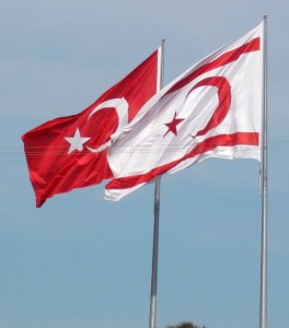 Two flags fly proudly over a hill outside Iskele... The Turkish Republic flag in the inverted colours of that of the mainland...