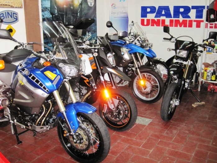 He has a Ducati, a Yamaha Super Tenere, a KTM street racer, a BMW1200GS, a Honda Tornado, an 1969 Triumph, a BMW R90s, a Gilera, two scooters and I think there was also a Suzuki dirt bike amongst the lot…!!