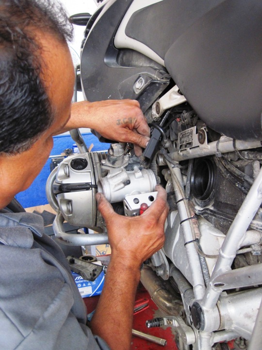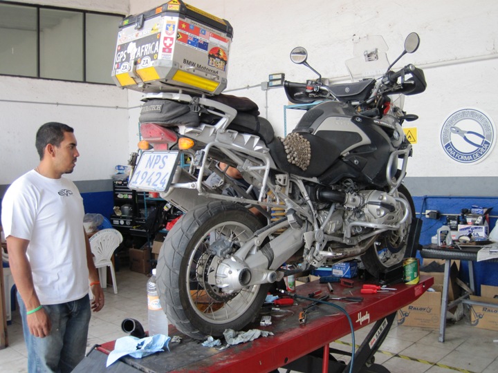 The chief mechanic, Julio, or “Mr Charming”, as he is affectionately known, listened while I explained how the bike was using too much fuel and oil, and that I thought the valves had not been set properly the last time I had it serviced in Peru…