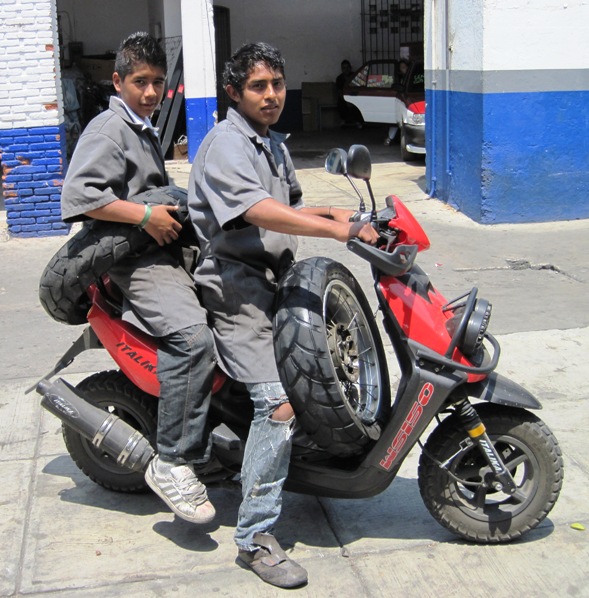 I did not have enough cash on me to pay for the service, and asked where the nearest ATM was located… A burst of Spanish from the Maestro and one of the apprentice mechanics dashed over to a little red scooter and indicated that I should climb aboard…!!