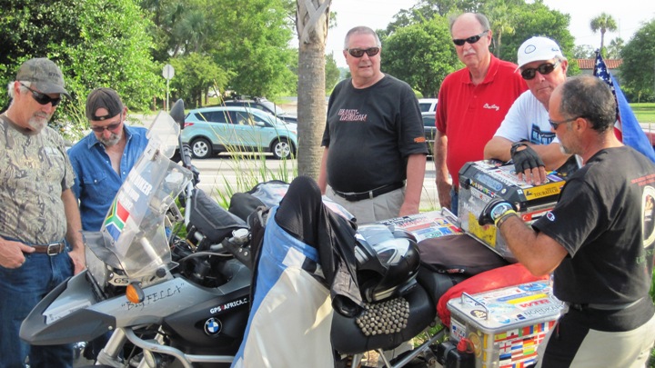 I rode back to Mimi’s to have dinner with a few friends that had been invited to see me off. Charles had prepared some tasty snacks and Rusty and Catherine were there too.. We took some photos of the bike before our friends left to go home and we set about doing some final packing…