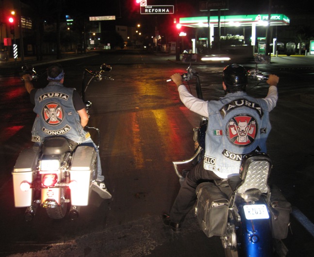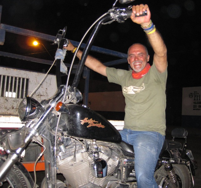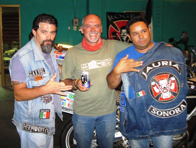Later that evening, in a large warehouse where the club park and service their bikes, Garfel and Kamaleon, posed for a photo with me… We spent a very pleasant evening emptying Tacate cans and enjoying tasty tacos…