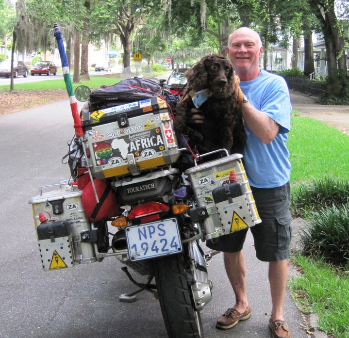 While we chatted, Nick, blind as a bat, bumped his way around and into the bike until Rusty finally picked him up and set him on my pannier for a photo call…